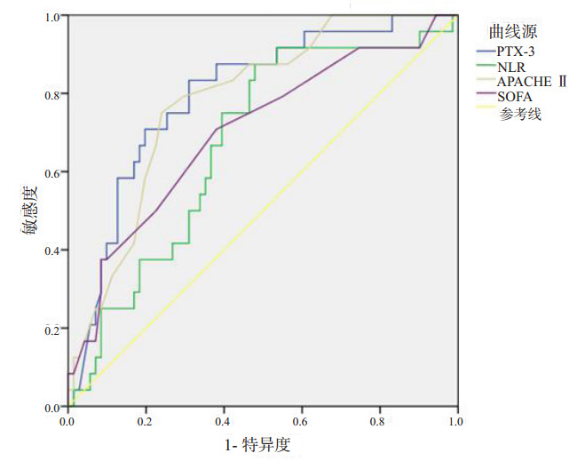 图 1 PTX-3、NLR、APACHE Ⅱ、SOFA评分预测脓毒症病死率预测的ROC曲线 |
