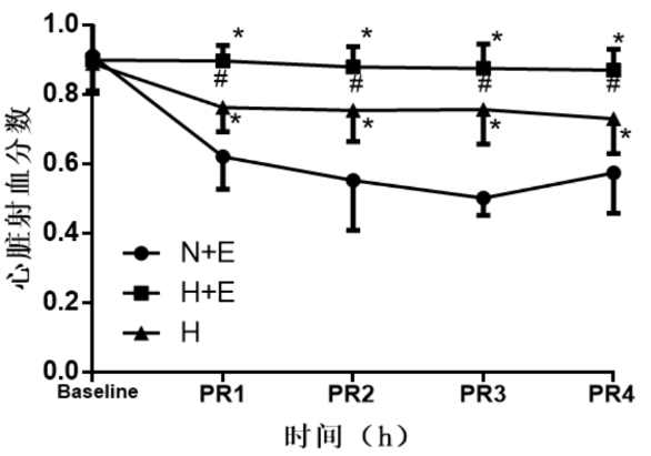 | 与N+E组比较,aP < 0.05;与H组比较,bP < 0.05。PR:复苏后 图 2 三组大鼠心脏射血分数比较 Fig 2 The comparison of heart ejection fraction in three groups |