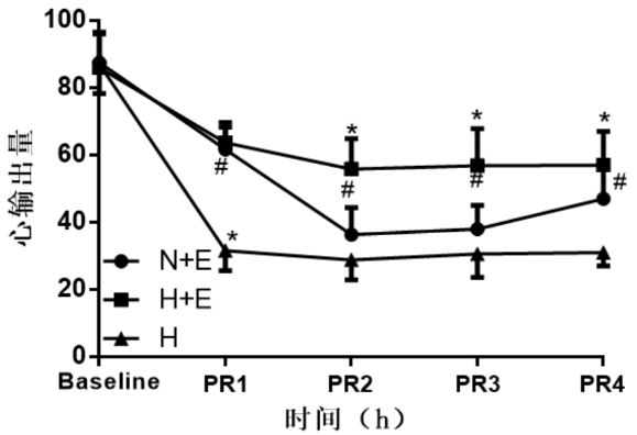 | 与N+E组比较,aP < 0.05;与H组比较,bP < 0.05。PR:复苏后 图 3 三组大鼠心输出量比较 Fig 3 The comparison of cardiac output in three groups |