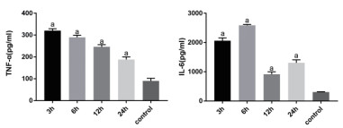 | 各时间点组与对照组相比较,aP<0.05 图 2 CLP术后不同时间点小鼠TNF-α和IL-6的变化 Fig 2 The variation of ALT and AST after CLP between different mice group |