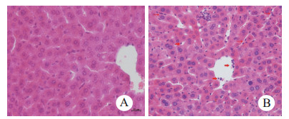 | A:对照组, B:CLP 6h组 图 3 小鼠肝组织病理学改变(HE, ×400) Fig 3 Pathological changes in mouse liver tissue |