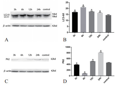 自噬是一种进化上高度保守的细胞过程,由双层膜包裹着入侵微生物,受损、衰老的细胞器或异常蛋白质形成自噬体,后与溶酶体融合形成自噬溶酶体,内容物被降解,有用的物质被重新用于合成代谢途径和能量产生[1-2]。自噬过程的完成需要诸多自噬相关分子参与完成,其中LC3蛋白和P62蛋白位置十分重要。当自噬体开始形成时,LC3-Ⅰ经剪切和泛素化加工修饰后与自噬体膜表面的磷脂酰乙醇胺(PE)偶联,成为膜结合形式的LC3-Ⅱ定位于自噬体内膜和外膜并且稳定地保留在其上直到与溶酶体融合,因此LC3Ⅱ被用作自噬体的标记分子反映细胞自噬的程度。P62蛋白作为自噬体膜形成的参与者同时也作为自噬底物其含量多少被广泛用来评价自噬的进程。