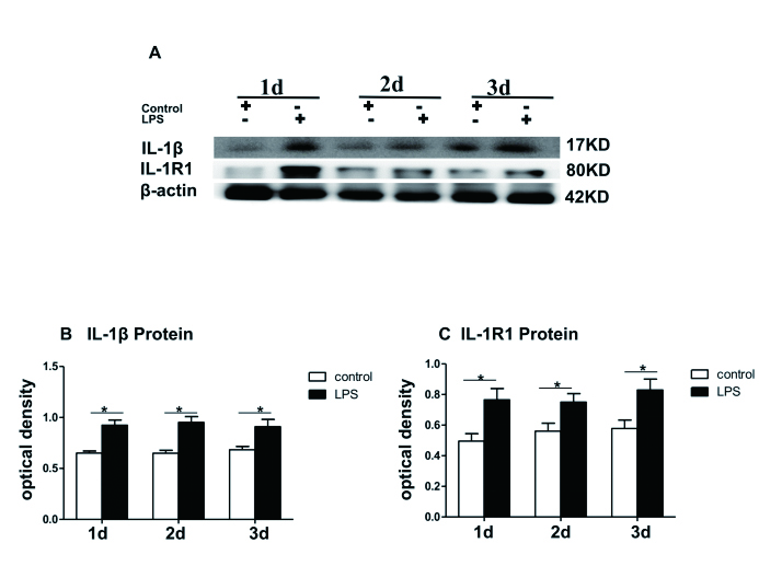 蛋白印迹检测海马组织发现:与对照组相比,腹腔注射LPS 1、2、3 d,海马组织IL-1β(正态性检验各组P > 0.05; 1 d control组vs 1 d LPS组:t = 5.114,P < 0.05;2 d control组vs 2 d LPS组:t = 4.811,P < 0.05;3 d control组vs 3 d LPS组:t = 2.888,P < 0.05)和IL-1R1(正态性检验各组P > 0.05,1 d control组vs 1 d LPS组:t = 3.060,P < 0.05;2 d control组vs 2 d LPS组:t = 2.534,P < 0.05;3 d control组vs 3 d LPS组:t = 2.802,P < 0.05)表达明显上调,见图 2。