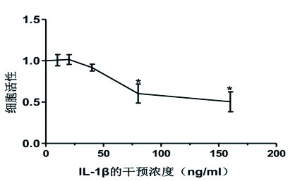 为确定IL-1β的干预浓度,采用CCK-8试剂盒检测给予原代海马神经元不同浓度(0、10、20、40、80、160 ng/mL)IL-1β处理后神经元的活性。结果显示:在IL-1β浓度不超过40 ng/mL时,神经元能保持相对较高的活性(10个vs 0个,P > 0.05;20个vs 0个,P > 0.05;40个vs 0个, P > 0.05);当IL-1β在80和160 ng/mL的浓度时,细胞活性明显下降(80 vs 0, P < 0.05;160 vs 0, P < 0.05),因此选择40 ng/mL浓度的IL-1β处理神经元(正态性检验各组P > 0.05, 方差齐性检验P = 0.121)。见图 4。