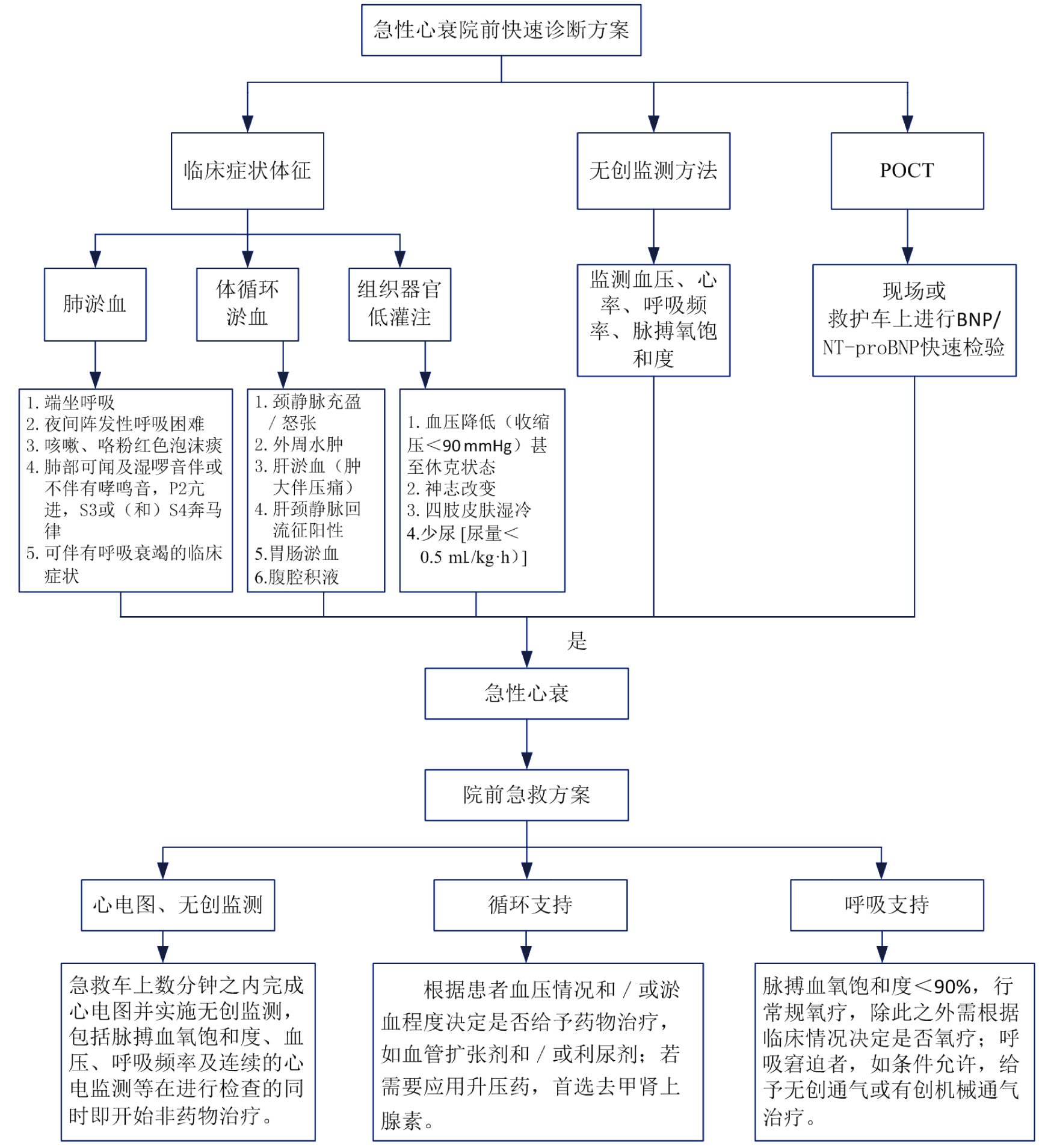 “快速诊断”是急性心衰单元院前阶段的关键组成部分,但限于急救车上有限的监测和检查方法,推荐通过肺淤血、体循环淤血或组织器官低灌注等临床症状或体征以及必要的无创检查方法进行快速诊断,有条件的院前急救单位可以在救护车上进行BNP/NT-proBNP的快速检验(POCT)[24],图 3。