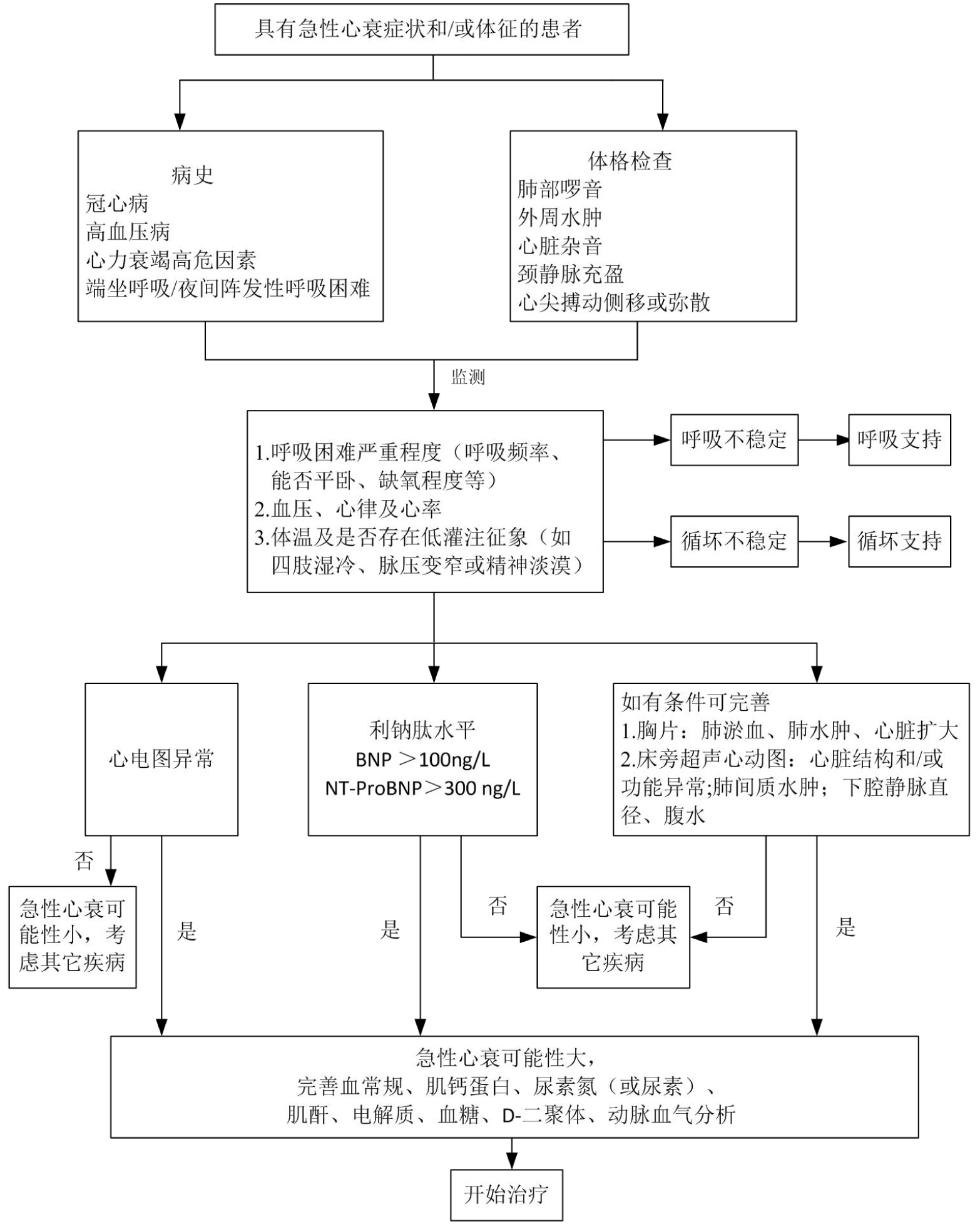 应在院前阶段快速诊断方案的方法和诊断基础上,进一步采集病史、查体并进行必要的辅助检查以进行院内快速诊断,同时快速识别出致命性因素,需要紧急处理可导致心功能迅速恶化的各种病因及诱因,如急性冠状动脉综合征、高血压急症、严重心律失常、心脏急性机械并发症、急性肺栓塞等[25]。