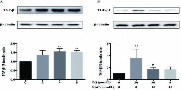 如图 3所示,与对照组相比,TGF-β1的蛋白水平表达在4 d时显著升高。预孵10 mmol/L NAC 2 h后,PQ染毒4 d,与PQ组相比,TGF-β1的蛋白水平表达显著下降,提示NAC通过抑制TGF-β1的表达抑制了PQ刺激A549细胞产生的EMT。