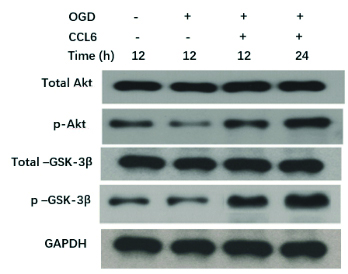 和对照组相比,免疫印迹显示OGD和CCL6处理对心肌细胞中总Akt含量没有明显影响,但OGD导致磷酸化Akt水平下降,而外源性添加CCL6可以增加p-Akt含量。GSK-3β是PI3K/Akt通路的下游信号分子,免疫印迹显示,随着Akt通路活化,磷酸化GSK-3β水平也显著上升(图 5)。不同组别中总Akt和总GSK-3β的表达水平差异无统计学意义(P > 0.05)。