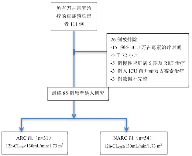 1.2 研究方法 1.2.1 分组根据万古霉素治疗前患者12 h-CLCR,将入选患者分为两组,高溶质清除组(ARC组)和非高溶质清除组(NARC组),ARC定义为12 h-CLCR > 130 mL/(min·1.73 m2)。