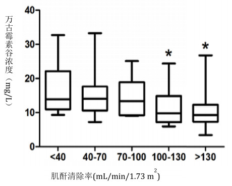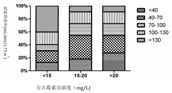 | 图 3 不同万古霉素血药浓度组肌酐清除率分布情况 |