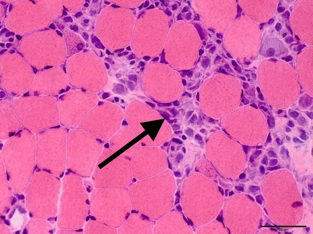 | 图 2 左肱二头肌肌肉活检HE染色(箭头所指为肌纤维坏死) |