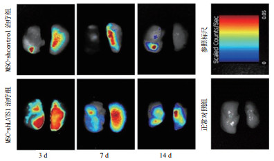 | 图 1 MSC-shcontrol治疗组及MSC-shLATS1治疗组离体肺近红外成像比较 Fig 1 Near infrared images of ex-vivo lung in the MSC-shcontrol and MSC-shLATS1 groups |