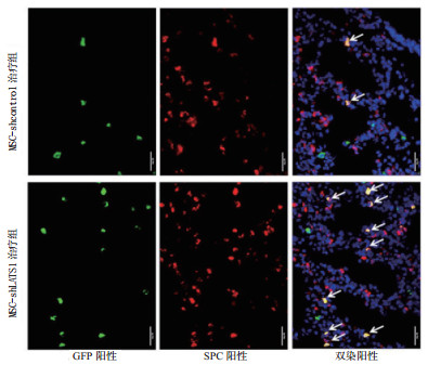 | 白色箭头所示为GFP阳性细胞,×400, 标尺=20 μm 图 2 MSC-shcontrol治疗组及MSC-shLATS1治疗组肺组织免疫荧光染色比较 Fig 2 Immunofluorescence staining of lung tissue in the MSC-shcontrol and MSC-shLATS1 groups |