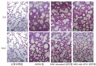 1.4 实验动物分组及处理将C57BL/6小鼠随机(随机数字法)分为4组(n=36):正常对照组、ARDS组、ARDS+空干扰病毒转染的mMSCs (MSC-shcontrol)治疗组、ARDS+转染干扰LATS1病毒的mMSCs(MSC-shLATS1)治疗组。正常对照组小鼠则向气道内注入与LPS等体积的50 μL生理盐水,4 h后再向气道内注入30 μL的PBS;ARDS组小鼠复制LPS-ARDS模型后4 h再向气道内注入30 μL的PBS;ARDS+MSC-shcontrol治疗组小鼠复制LPS-ARDS模型后4 h再向气道内注入含空干扰病毒转染mMSCs的PBS 30 μL(细胞数5×104);MSC-shLATS1组小鼠复制LPS-ARDS模型后4 h再向气道内注入含转染干扰LATS1病毒mMSCs的PBS 30 μL (细胞数5×104)。在建立LPS-ARDS模型后3、7、14 d处死小鼠,留取肺组织待检。