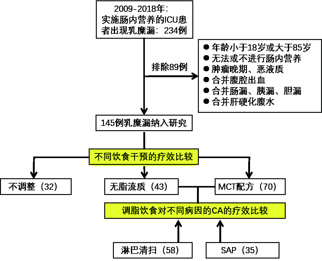 关于CA的治疗, 过去的治疗原则为通过静脉营养结合禁食减少淋巴系统的流量, 同时等待损伤的淋巴管道愈合。但是近10年来, 肠内营养(enteral nutrition, EN)的价值得到了高度重视, 除了其通过增加内脏血流增强肠道免疫系统功能外[3], 更为重要是通过直接营养肠上皮达到巩固肠黏膜屏障、减少肠道细菌移位的目的[4-7]。故因为CA的治疗的需要而放弃肠内营养并不利于机体的恢复, 甚至可能带来肠源性感染的隐患。造成乳糜漏难以自愈的内在因素为始终存在较大的腹腔淋巴液流量, 而其机制即为肠道吸收的脂肪酸所形成的乳糜微粒的大量增加。更加深入的研究发现饮食中的长链甘油三酯(LCT)主要通过淋巴系统运输, 其为导致淋巴液中乳糜微粒浓度升高的主要原因, 而中链甘油三酯(MCT)从肠道吸收后直接经门静脉入肝, 故对淋巴液的产生影响较小[2, 8]。所以选择何种肠内营养制剂不仅影响乳糜液的生成, 同时也影响了机体营养状态及创面的愈合, 将成为决定CA恢复速度的关键因素。同时如何评估不同疗法对不同原因造成的CA所产生的疗效亦将成为该领域的研究重点。本研究将对一组采用不同肠内营养方式干预外科疾病所继发的乳糜漏的病例进行疗效相关的回顾性分析。