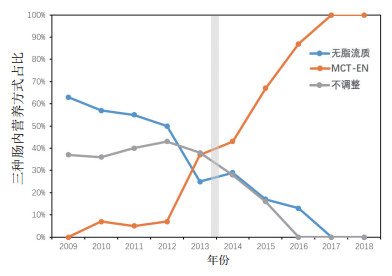 2 结果具备肠内营养干预条件的145例乳糜漏患者的病因分别为:①腹腔淋巴结清扫73例; ②重症急性胰腺炎(severe acute pancreatitis, SAP)49例; ③其他23例, 包括暂不需手术的腹部闭合伤、腹腔感染等。所有患者在出现乳糜漏后均继续进行肠内营养, 其中改为无脂流质43例、MCT制剂70例、EN方案未调整32例(图 1)。3种肠内营养方式应用于乳糜漏的干预在过去的10年中出现了明显的变化趋势, 2009年至2013年主要为采用无脂流质饮食; 而2014年之后MCT作为一种新的治疗理念和方法被迅速接受, 并且最终成为所有乳糜漏患者的饮食调整方案(图 2)。