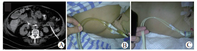 一例重症急性胰腺炎(SAP)合并乳糜漏的典型患者的治疗过程见图 3。SAP发病3 d内经过液体复苏、呼吸机辅助呼吸、腹腔引流(腹腔引流管位置见图 3A)等治疗后病情趋于稳定, 第3天予开通肠内营养(能全力), 次日即出现乳糜漏(牛奶样腹水, 图 3B), 2 d后肠内营养液改为MCT制剂(百普力), 24 h后腹腔引流液变为黄色澄清(图 3C)。患者未因为乳糜漏造成肠内营养的终止, 并最终痊愈。