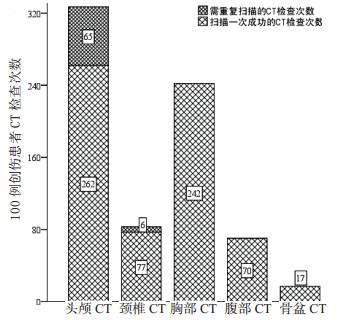 | 图 1 100例创伤患者各部位CT检查的重复扫描情况 |