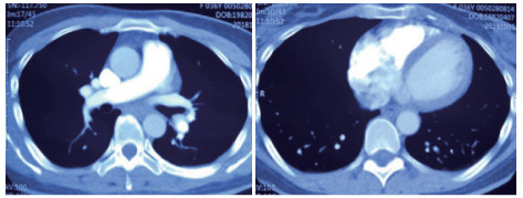 | 图 2 入院时CTPA提示双肺主干明确充盈缺损 |