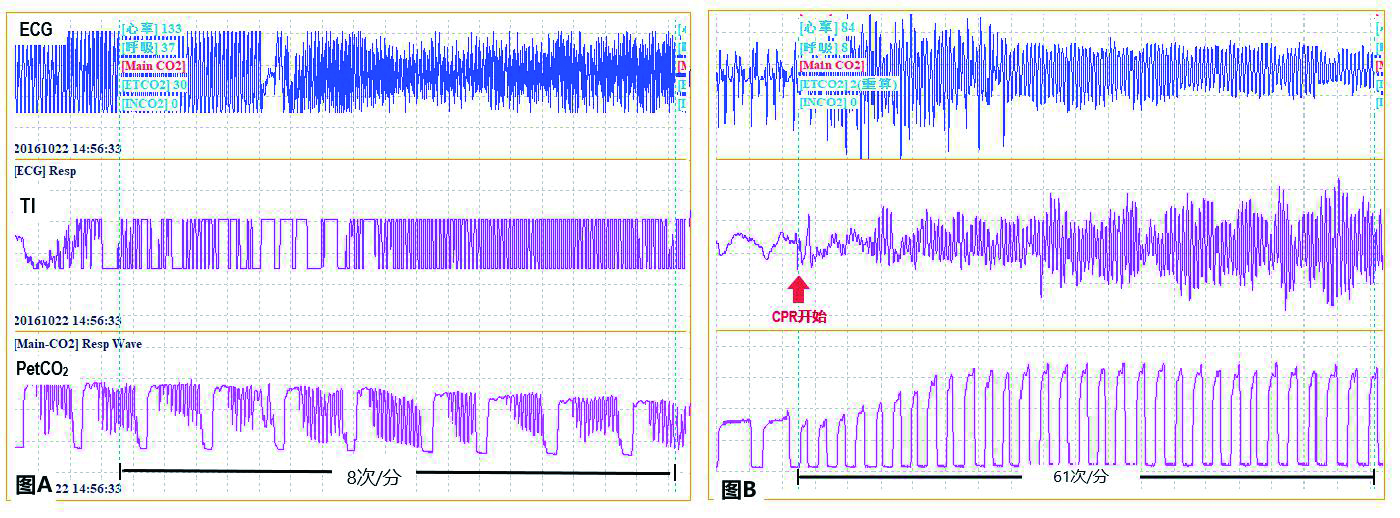 | ECG心电图,TI胸阻抗法计算通气频率,PetCO2:呼气末二氧化碳。图A是采用简易呼吸器进行人工通气,通过主流二氧化碳监测得到的波形图,经计数二氧化碳波形可的出通气频率为8次/min。图B是通过主流二氧化碳波形监测得到的波形图,经计数二氧化碳波形可的出通气频率为61次/min,在CPR开始后,通气频率明显升高 图 1 通过PetCO2波形图计算CPR中通气频率的方法 Fig 1 The methods of calculating ventilation rate in CPR by PetCO2 |
