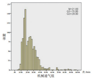 | 图 2 采用机械通气时,实际通气频率频数直方图 Fig 2 The histogram of actual ventilation rate during mechanical ventilation |