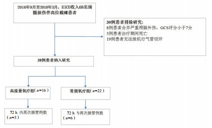 1 资料与方法 1.1 研究类型及伦理问题回顾性研究国内三甲医院急诊创伤中心ICU从2016年9月至2018年3月中,颈椎损伤伴截瘫患者,行颈椎手术治疗后进行脱机试验,符合脱机拔管标准后拔管。使用普通面罩、文丘里面罩或经高流量吸氧进行氧疗支持,患者选择普通氧疗或高流量吸氧治疗均有当时主治医师决定并取得家属同意。比较拔管后两种不同氧疗方式对拔管结局的影响。本研究符合医学伦理学标准,在获得医院伦理委员会批准同意后使用患者资料进行科学分析[审批号:2017伦审研050号(浙医二院)],并获得患者或家属的知情同意。