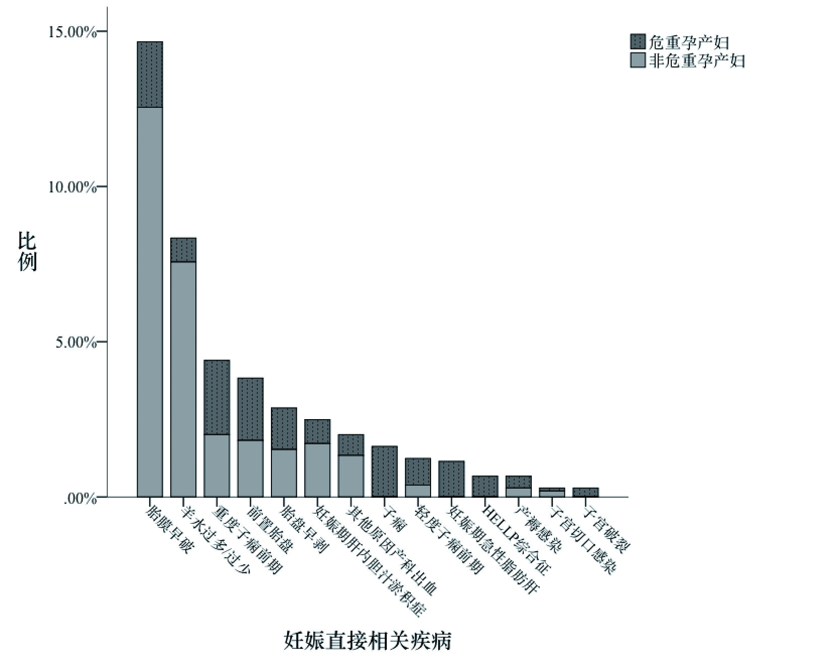 3 讨论本研究回顾性分析了杭州市危重孕产妇救治中心4年内留抢的所有孕产妇信息并发现,1044例留抢孕产妇中,危重孕产妇占39.94%,非危重孕产妇占60.06%。孕产妇留抢的前三位妊娠直接相关疾病分别为胎膜早破、羊水过多/过少、重度子痫前期。孕产妇留抢的前三位非妊娠直接相关疾病分别为消化系统疾病、呼吸系统疾病、内分泌结缔组织疾病。危重孕产妇的危险因素包括高龄、初中及以下学历、经产以及合并内外科疾病。