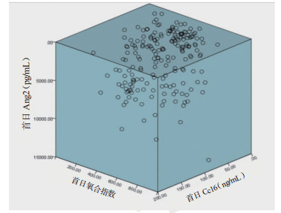 | 图 1 ARDS患者首日Ang-2、CC16和氧合指数间两两的关系(n=100) Fig 1 The correlation between Ang-2, CC16 and oxygenation index in the first day in ARDS patients (n=100) |