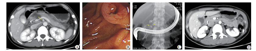 | 图 1 患者术前术后影像学检查结果及术中所见[A:患者术前CT扫描,箭头处胰头破裂,胰腺形态大,密度混杂;B:内镜逆行胰胆管造影(ERCP)见十二指肠壁充血水肿,乳头有血性液体流出;C:箭头处可见胰腺颈体部主胰管有造影剂外渗;D:ERCP治疗4个月后复查CT胰头处混杂密度消失] |