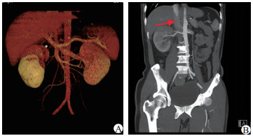 | 图 1 患者CTA结果(A:3D血管显像;B:箭头示右肾静脉血栓) |