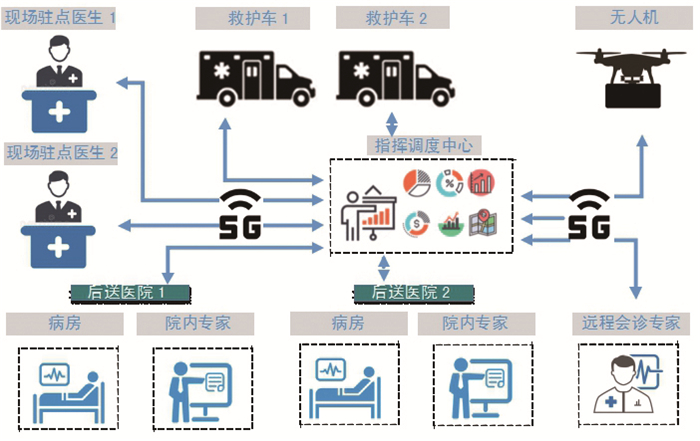 网络环境的不稳定和传输能力是限制医疗急救保障系统功能的重要因素。目前使用的4G网络相对于3G网络虽能提供质量更高的远程视频通话和视频检查,然而仍然会因为网络覆盖范围不全面导致无法连接,且无法提供多路、高清晰视频信号,对医疗质量提升有限[7]。新一代5G通讯技术高带宽、高速率、低时延的优势,使得现场-救护车-医院-指挥中心-专家的高效信息链接成为可能。一旦现场突发急症,如心脏骤停,急性心梗,脑梗,严重创伤等,最关键的是在最快时间内确定诊断,争分夺秒地进行抢救,5G网络就可以发挥巨大的优势,让传统的点对点急救上升为体系化救治。现场驻点医生快速评估患者情况,将多角度高清视频传输至指挥中心,院内专家佩戴VR眼镜身临其境地指导现场医生进行抢救,实时VR过程中识别的景象会发生连续大量的动态变化,目前4G网络难以负荷这样庞大的计算量,而5G可以很好地解决时延问题,在极短的时间内将多个摄像头采集的数据上传、集成、渲染和传输。抢救过程中需要用到特殊药品,血制品等,可以利用无人机系统进行快速调配[8],无人机在高速、稳定的5G网络支持下能自主精准导航,连接云端服务器比使用4G网络时速率提升10~100倍,时延缩短5倍,显著提升了飞行的平滑度和安全性。在急诊救治中超声被称为“看得见的听诊器”,5G网络支持超声图像毫s级超低时延回传,随着现场B超探头的移动,患者图像、彩超画面也能同时传回指挥中心,保证院内专家准确判读。总之,5G网络能满足大型社会活动急救保障过程中的患者信息与实时生命数据传输、高清视讯互动、远程超声诊疗,无人机物资调配和VR画面实时传输等需求[10],真正实现“上车即入院”。
