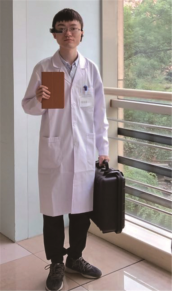 | 图 3 驻点医生配备现场急救终端箱、戴AR眼镜、手持PAD Fig 3 The resident doctor equipped with an on-site emergency terminal box, AR glasses, and a handheld PAD |