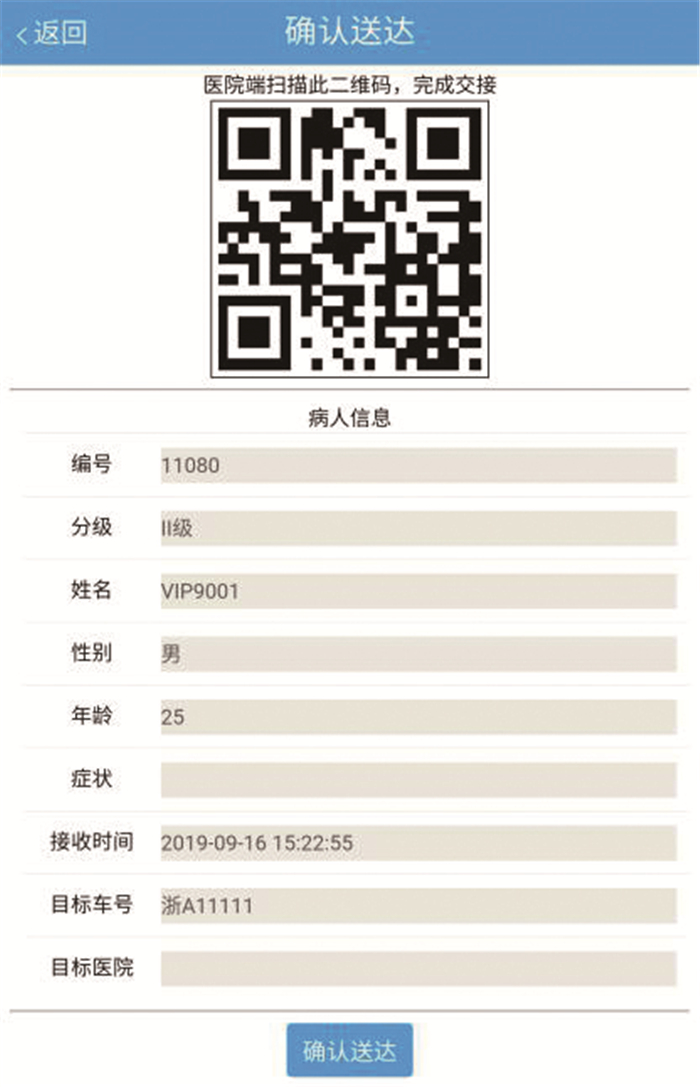 (3)医院终端。医院终端可同样配备华为M5平板电脑或者PC终端,在救护车达到医院时,扫描车载急救终端上的二维码即完成交接,获取患者完整的病历信息和院前救治经过等,避免口头交接时的信息丢失。