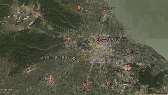 | 1:水口乡卫生院; 2:小浦镇卫生院; 3:煤山镇卫生院; 4:林城镇卫生院; 5:虹星桥镇卫生院; 6:吕山乡卫生院; 7:李家巷卫生院; 8:洪桥镇卫生院; 9:画溪街道卫生服务站; 10:夹浦镇卫生院 图 1 长兴县人民医院和10家卫生院的地理信息及无人机飞行路线图 Fig 1 Location information of health centers in Changxing County and the drone flight routes |