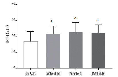 | 与无人机飞行时间相比,aP<0.01 图 3 无人机飞行时间与3种地图软件测定的午夜0点道路交通时间比较 Fig 3 Comparison of drone flight time and road traffic time measured by Baidu map, Tencent map and Amap at 0 a.m |