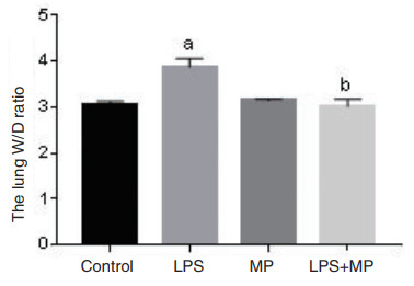 2 结果 2.1 肺组织湿/干质量比(W/D)改变LPS组肺组织W/D(3.87±0.17)与Control组(3.05±0.57))相比显著升高,而LPS+MP组肺组织W/D(3.01±0.84)较LPS组明显降低,差异具有统计学意义( F= 2.420, P= 0.038)(图 1)。
