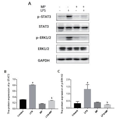 此外,STAT3和ERK1/2通路之间存在交互调控,ERK1/2可能是调节STAT3活性的上游通路信号之一[27-28]。Kakisis等[29]研究发现抑制ERK1/2活化可以阻止STAT3的丝氨酸磷酸化。本实验中,在LPS诱导小鼠发生ALI后给予MP干预,肺组织p-STAT3及p-ERK1/2蛋白表达均下降,MP抑制ERK激活和STAT3活性,两者之间的调控关系仍需进一步深入研究与探讨。