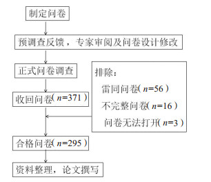 2 结果 2.1 研究流程和研究对象本研究共295份问卷纳入最终分析(见流程图 1),其中男性为183名(62.03%),平均年龄为33(30,39)岁,ICU工作年限为6(3,12)年;在学历方面,本科以下占1.36%,本科53.90%,硕士42.03%,博士2.71%;职称方面,住院医师36.61%,主治医师33.56%,副主任医师22.37%,主任医师7.46%;医院等级方面,三甲医院62.37%,三乙医院25.76%,二甲医院11.86%;综合ICU 93.90%,急诊ICU 5.42%,专科ICU 0.68%。
