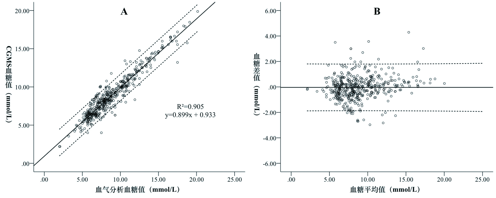 | 图 1 465对CGMS血糖值与血气分析血糖值的散点图(A)和Bland-Altman检验(B) |
