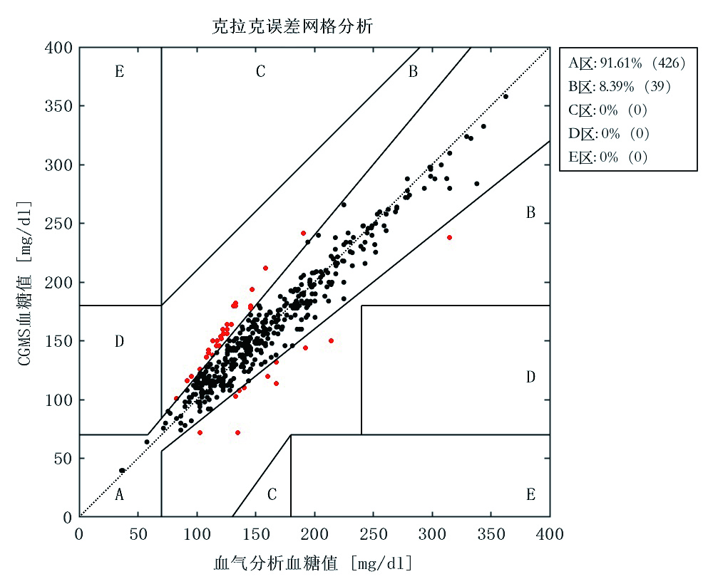 | 图 2 465对CGMS血糖值与血气分析血糖值的克拉克误差网格分析 |