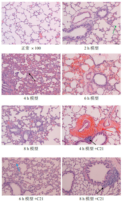 正常组未见明显病变;通气2 h模型血管周围水肿,血管或气管周围可见炎细胞浸润,局部可见肺泡腔扩张;通气4 h模型肺泡腔内可见出血明显,肺泡和间质内有炎症细胞浸润,肺泡腔内有红细胞,并有水肿和炎细胞浸润,肺泡腔扩大;通气6~8 h模型血管周围水肿,炎细胞浸润明显,肺泡腔扩大较小。腔内部分少量红细胞,部分可见透明膜的形成,肺泡腔内有水肿液。相对于4 h损伤组,水肿程度减少。4 h模型+C21、6 h模型+ C21、8 h模型+ C21组,肺泡和间质内的水肿和出血相对于模型组相应时间段损伤组均有不同程度减轻,炎症细胞浸润减少,水肿液吸收,但仍可见肺泡扩张现象。见图 1,并进行肺损伤病理评分,见表 1。