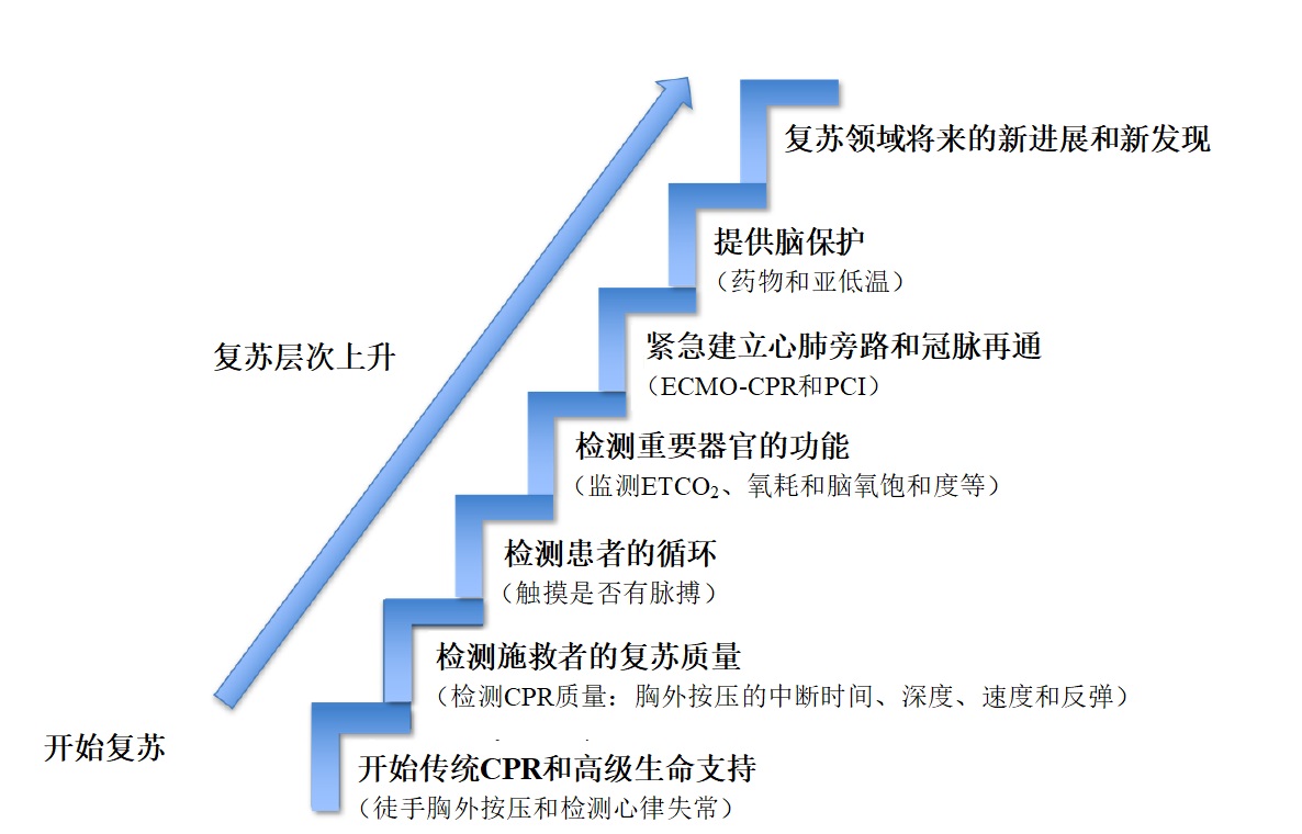 5.2 通过“分层模型”实现CPR的个体化为了从根本上提高CA患者的存活率, 2019年美国的Kuschner和Becker提出现代复苏的“分层模型”[26]。复苏从模型的底层开始, 然后逐步向顶层发展。模型的底层是最简单的徒手CPR, 然后评估施救者胸外按压的质量(操作是否符合指南要求), 更高层次的是通过监测脉搏、呼气末二氧化碳分压(ETCO2)、氧耗、动脉压、脑灌注等评估CPR对患者生理的直接影响, 最后可根据患者需求选择更高级的复苏方案(如ECMO、经皮冠脉介入术、亚低温, 以及恢复细胞代谢和预防再灌注损伤的多种药物组合应用等)。这个“分层模型”固然有不足之处且需要继续完善, 却反映了真实世界里CA患者的现状和需求, 即需要实施个体化的CPR。