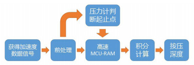此胸腔按压反馈仪基于加速度二次积分算法,在按压片上集成额加速度测量模块、压力最值检测模块及高速MCU,通过对压力最小值与最大值之间的采样加速度数值进行二次积分获取位移。由于要在颠簸的转运环境中进行测试,设备应能够在恶劣环境下监测按压深度。在按压过程中,每按压一次进行一次积分,积分完成后及时复位,下一次按压重新进行积分。胸外按压过程中每一次按压到最深处,对应按压压力也最大。而等到胸腔完全回弹后,下一次按压开始时刻将会是按压压力最小的时刻。将按压力的压力最大时刻和最小时刻作为加速度数值积分的开始时刻和结束时刻。实际流程见图 1,采集按压运动加速度信号,通过对数据进行滤波去噪之后,进行波形形态分析,确定上述按压的起止点,最后对起止点之间的数据进行积分运算,得出按压深度。