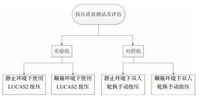 24名医护人员分为2组,实验组8人,实验过程中每名医护人员使用LUCAS2进行CPR。对照组16人,2人一队进行CPR。实验组与对照组分别在静止环境和颠簸的转运环境下进行CPR。其中静止环境为模拟病房平地,颠簸的转运环境则在运动救护车内,本试验流程见图 2。