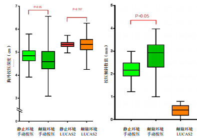 2 结果 2.1 按压深度和不充分的胸壁回弹比较结果共进行了16组测量,其中静止环境8组,颠簸的转运环境8组,按压深度数据及比较见表 1和图 3。可以发现受训后的医护人员进行手动按压在静止环境与颠簸的转运环境下按压深度差异有统计学意义,但使用自动CPR设备在两个环境下按压深度差异无统计学意义。多组间的比较采用单因素方差分析,由表 1可知,静止环境下的LUCAS2组和颠簸环境下的LUCAS2组间按压深度差异无统计学意义,其余组间比较均差异有统计学意义(P < 0.05)。颠簸的转运环境下手动按压的不充分胸壁回弹的次数由静止环境的76次增加到232次,而LUCAS2在颠簸环境下的不充分胸壁回弹次数仅为28次,见表 2。