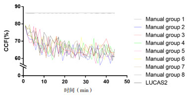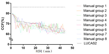 图 4、图 5列出了颠簸环境和静止环境下的CCF趋势,可以发现,双人组手动按压持续的时间越长,CCF值越低。从表 3可知,颠簸的转运环境中下双人交替手动按压的CCF值在60%~65%这一区间明显增大,但LUCAS2的自动CPR系统的CCF值在所有环境下都可以保持稳定。