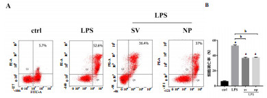 2 结果 2.1 辛伐他汀不同剂型对脓毒症内皮细胞凋亡的影响LPS处理内皮细胞24 h后,应用流式细胞仪检测凋亡情况,结果显示,较对照组,LPS组凋亡细胞数百分比从5.7%±1.1%增加到52.6%±1.6%(图 1A),而SV组与NP组能够减轻由LPS所引起的细胞凋亡,差异有统计学意义;但两组间差异无统计学意义(图 1B)。