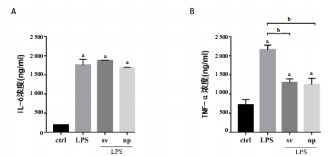 培养的内皮细胞中,炎性因子IL-6在对照组中表达较低,经LPS刺激24 h后,IL-6表达显著增高,而SV及NP组中,IL-6水平较对照组也明显增加,与LPS组间差异无统计学意义(图 2A)。与对照组相比,LPS组TNF-α表达升高,经辛伐他汀处理后,TNF-α含量较LPS组明显降低, 但SV组与NP组间差异无统计学意义(图 2B)。