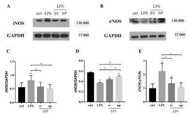 LPS处理HUVEC细胞,脓毒症细胞模型造模。用SV及NP处理细胞后,提取细胞蛋白,Western bolt法检测iNOS和eNOS含量。结果发现LPS刺激后,iNOS表达明显升高,辛伐他汀处理后可下调HUVEC中iNOS的表达,NP组较SV组存在iNOS水平水平的改善,但组间差异无统计学意义,eNOS在LPS刺激后表达则显著降低,辛伐他汀可恢复eNOS在HUVEC中的表达,NP组对于eNOS的恢复效应要明显高于SV组,组间差异有统计学意义;iNOS/eNOS比值在LPS组显著升高,不同剂型辛伐他汀处理后明显降低,均有统计学意义,而在SV组和NP组间差异无统计学意义。见图 3。