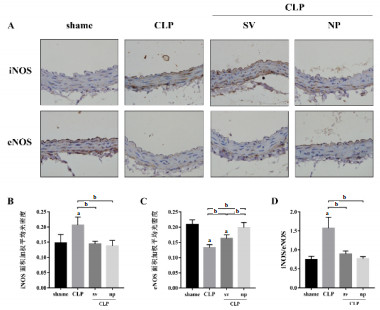 免疫组化结果(图 4)显示,与假手术组(shame)相比,CLP组eNOS蛋白的半定量表达明显降低(图 4A、C),而iNOS的半定量表达明显增高;SV和NP均有提高eNOS蛋白水平的效应,且NP较SV更有助于eNOS浓度的改善,差异有统计学意义;SV组和NP组中iNOS水平较CLP组逐渐下降,差异有统计学意义,SV组和NP组之间趋势有降低表现,差异无统计学意义;iNOS/eNOS的比值在CLP组显著升高,不同剂型辛伐他汀处理后明显降低,差异均有统计学意义,而在S V组和NP组间差异无统计学意义。